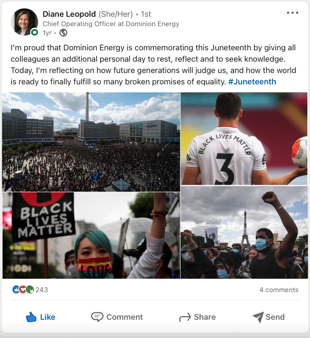 As her communications consultant, I got asked a lot of questions about the leader I supported stepping to the front when all eyes were on Dominion Energy and the other Fortune 500’s in Richmond, Virginia. She was the first and most outspoken supporter of equity on the leadership team, and I am proud to have helped her articulate that passion on a variety of channels.