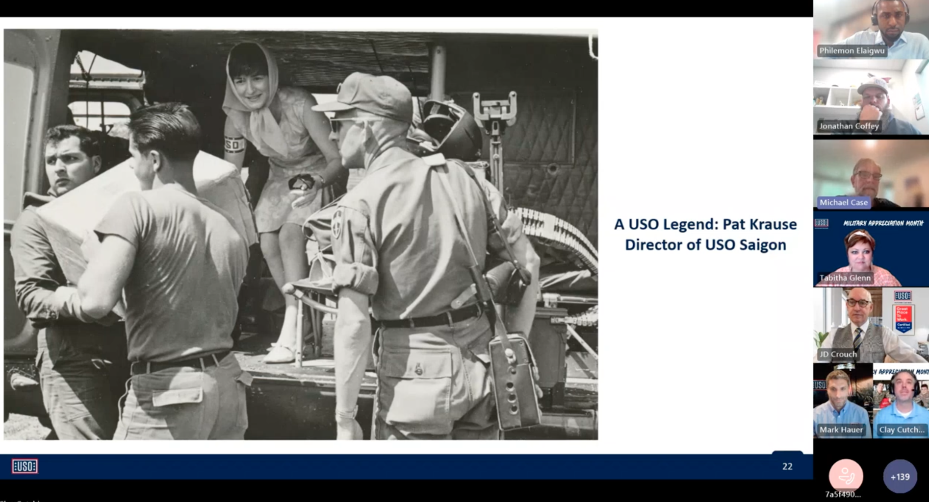 Our employees were fascinated to hear about Pat Krause, a USO staffer who travelled to some of the most dangerous parts of Vietnam to setup USO comfort centers across the battlefield. The troops loved her. She is one of only two people to be named an Honorary Green Beret. Our present day USO staffers stationed in the Middle East were especially moved to see whose footsteps they were following.
